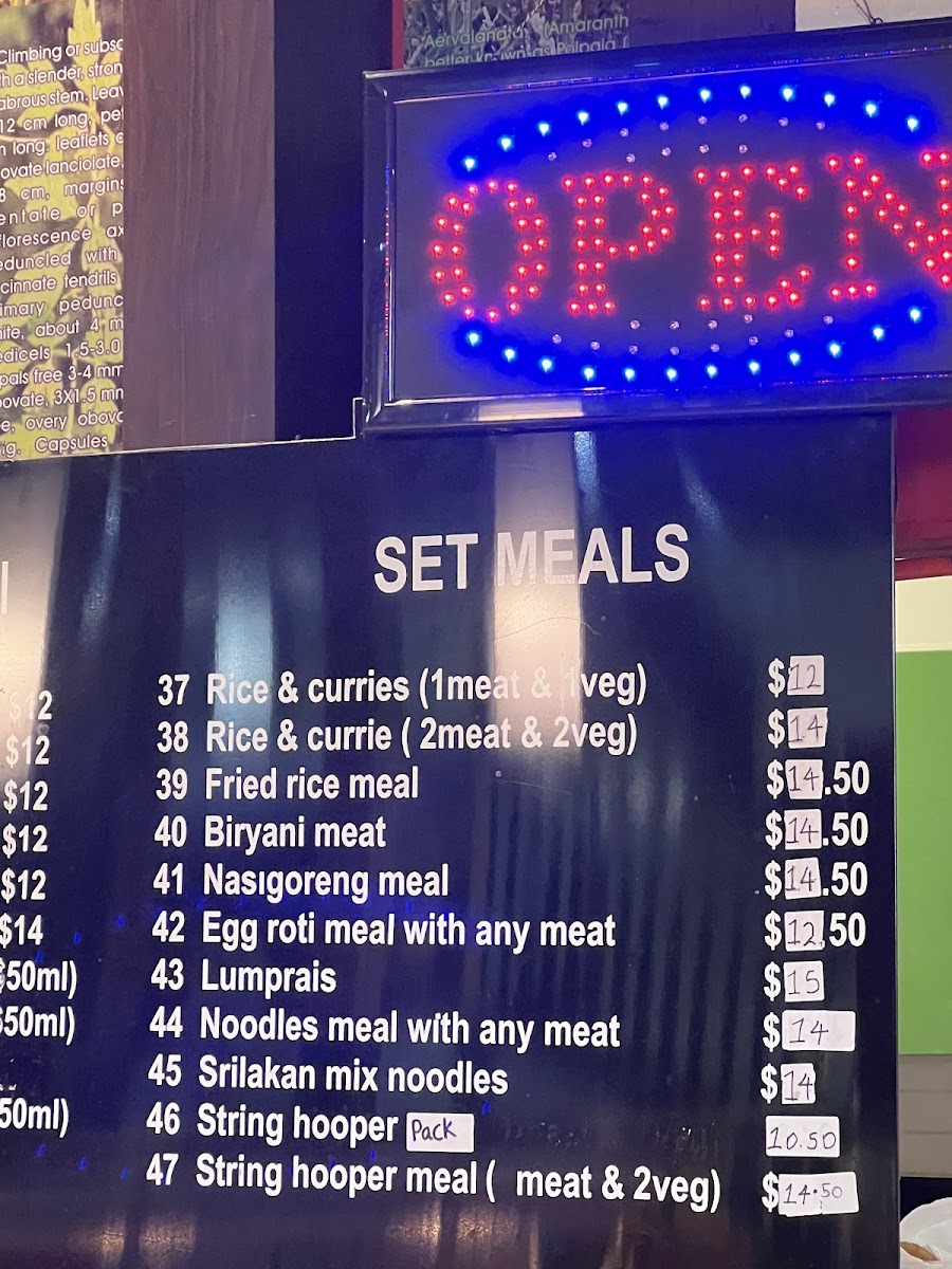 Accompanying the curries are a variety of rice options, including the fragrant Saffron Rice, the savory Egg & Veg Mixed Fried Rice, String Hoppers, and the more traditional Steamed Basmati Rice. For those looking for a richer meal, Biriyani Rice adds an extra layer of indulgence with its blend of aromatic spices and tender meat or vegetables.