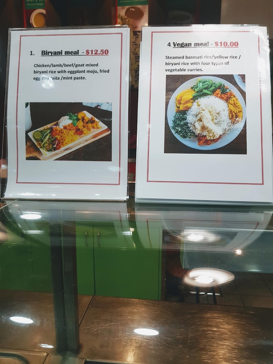 Biryani rice, eggplant moju, green salad, fried egg, raita/mint paste and one choice of meat (chicken curry/ beef curry/ lamb curry/ goat curry/ fish curry/ deviled chicken)
