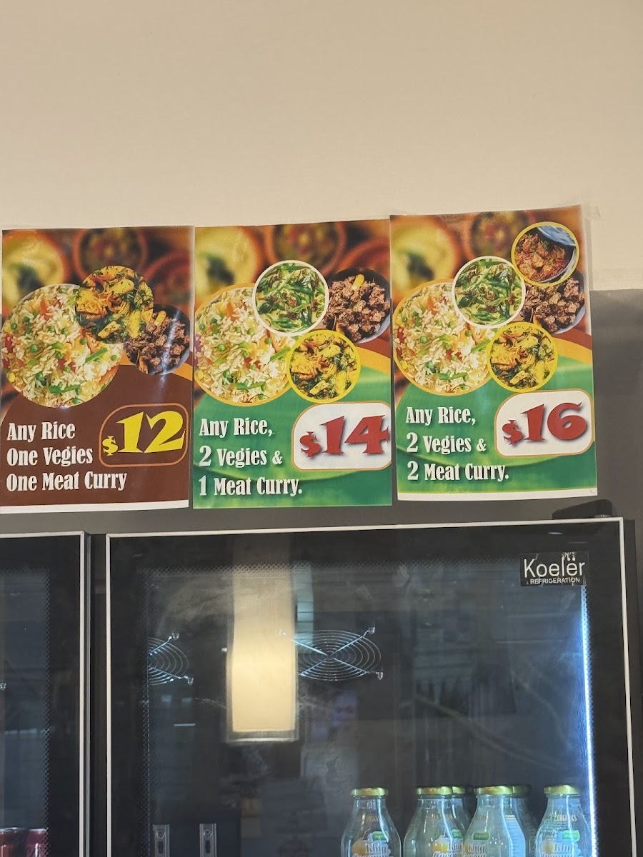 Plain rice/yellow rice/biryani rice with three types of vegetable curries and one choice of meat (chicken/lamb/beef/goat/ fish/deviled chicken )